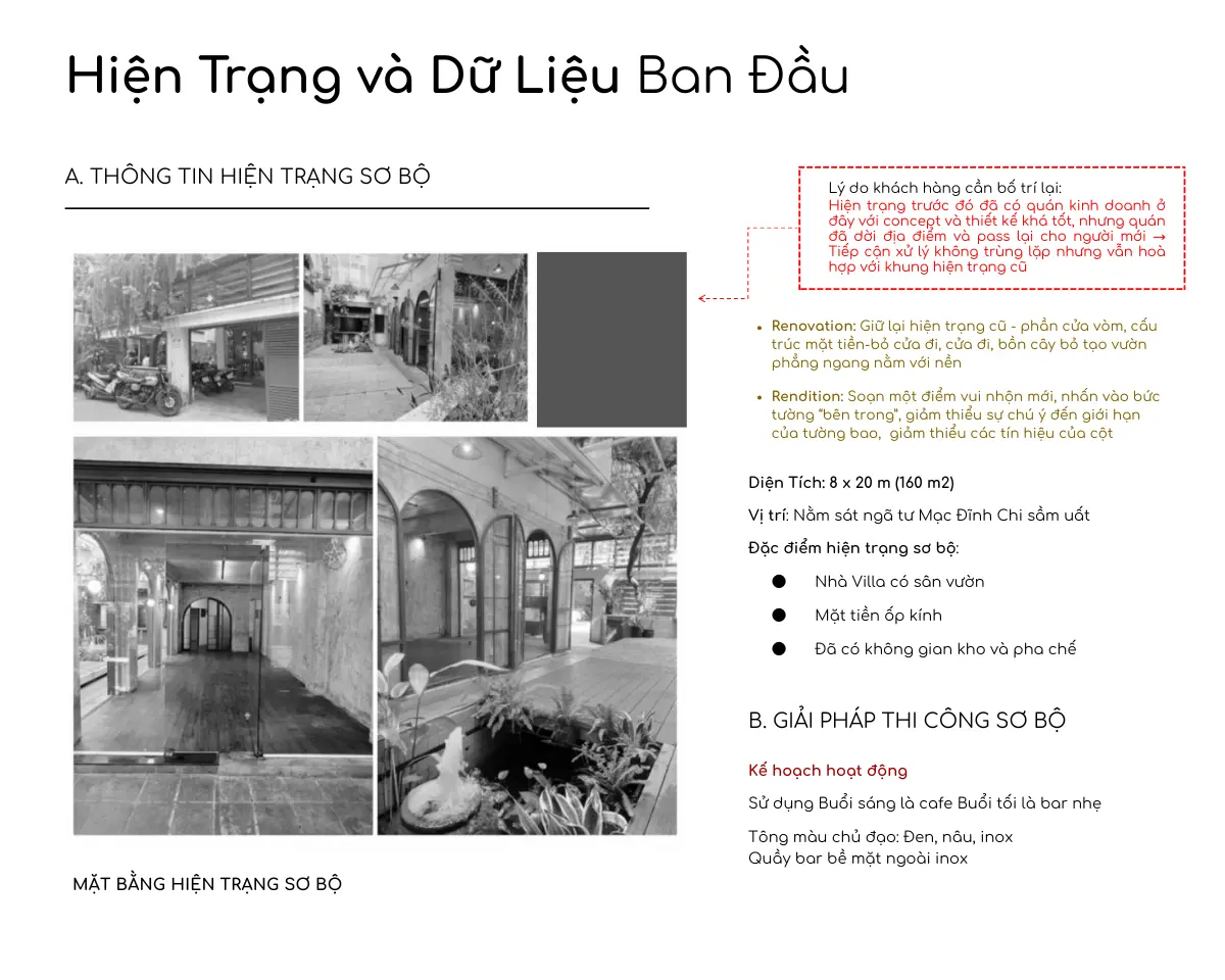 Trong dự án cải tạo lần này, MODESK đã thổi một làn gió mới vào không gian quán cà phê nằm ở trung tâm sầm uất Mạc Đĩnh Chi. Với diện tích 160m² và lợi thế sân vườn, mặt tiền ốp kính cùng bố cục cũ để lại từ nhiều lần kinh doanh trước, dự án đặt ra một bài toán không đơn giản: làm sao để giữ lại tinh thần cũ, nhưng phải đủ mới mẻ để định vị lại thương hiệu và trải nghiệm khách hàng.