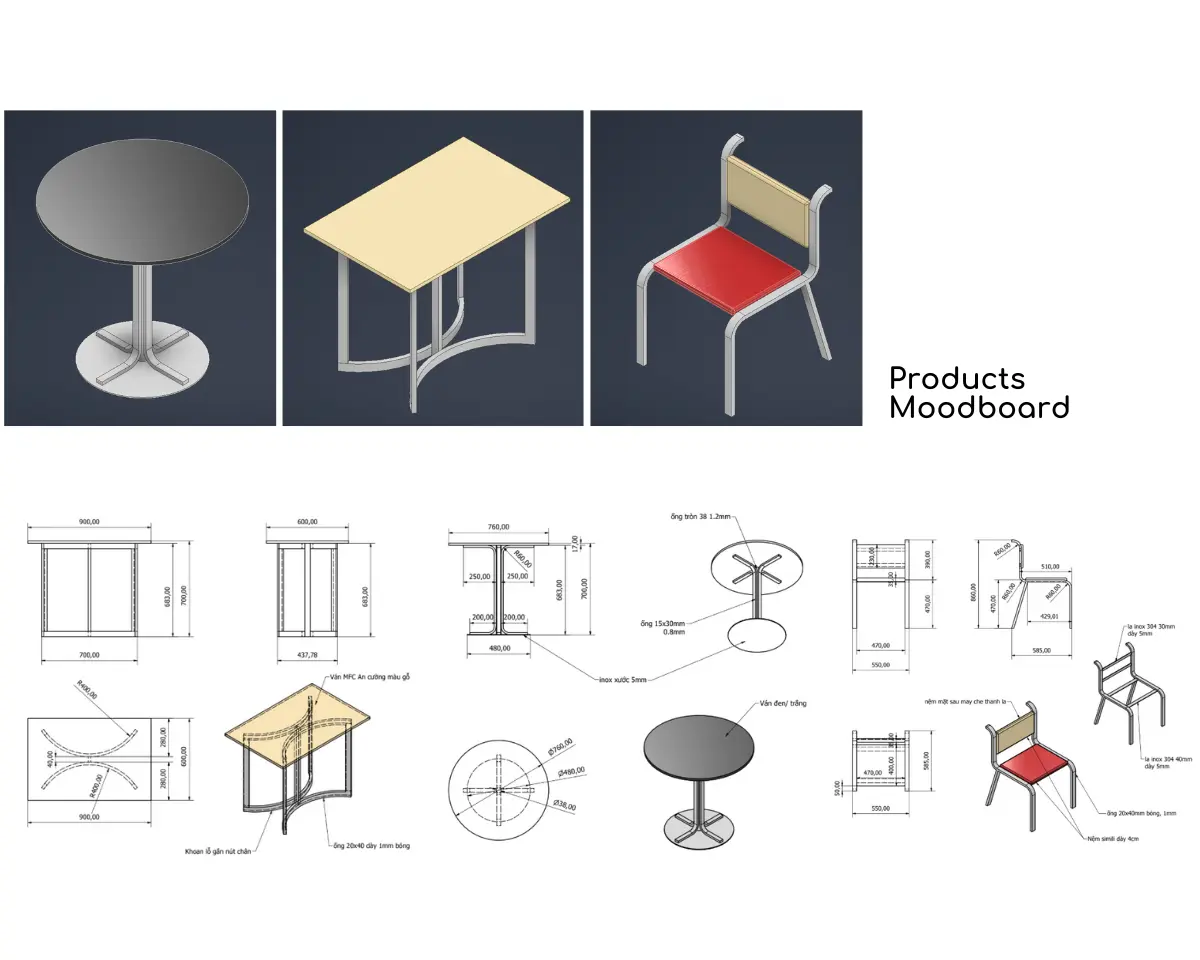 Các mẫu bàn tròn, bàn chữ nhật được thiết kế riêng, đi cùng hệ ghế phối chất liệu gỗ – inox – đệm đỏ, tạo nên sự đồng nhất nhưng không đơn điệu. Sự pha trộn giữa đường cong hiện đại và hình học cơ bản làm nổi bật tinh thần “mixture” mà MODESK theo đuổi.