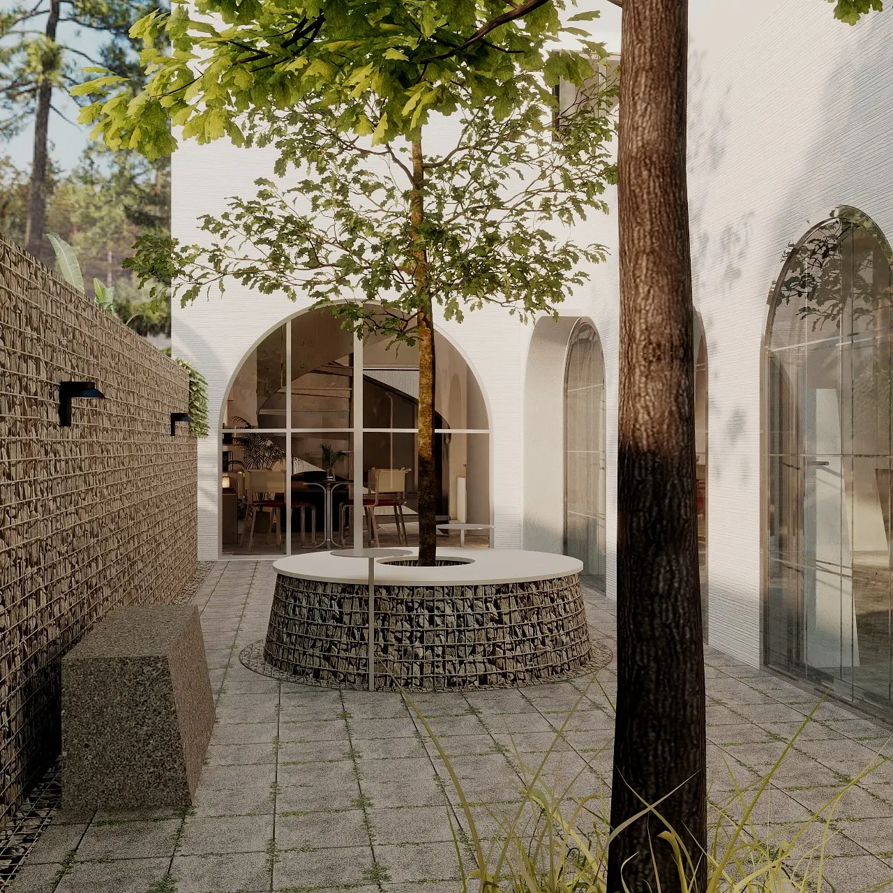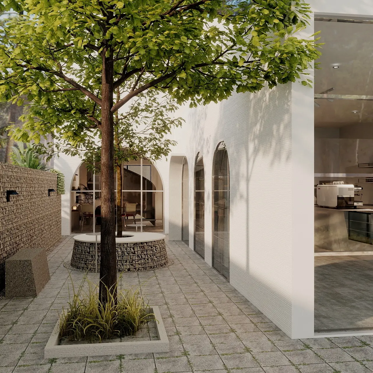 Sử dụng hệ bồn cây tròn bọc lưới đá, kết hợp kính lớn nhìn xuyên suốt vào bên trong. Đây là nơi tạo sự tiếp cận đầu tiên về thẩm mỹ – mộc mạc, nhẹ nhàng. Cây xanh bản địa được giữ lại và bố trí khoa học, làm mềm đi đường nét thẳng – vuông trong kiến trúc.