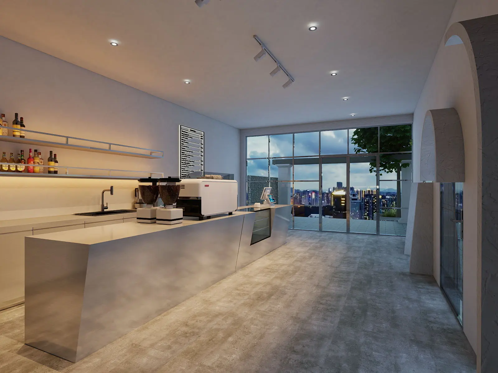 Thiết kế với chất liệu inox nguyên khối, quầy bar là điểm "cân bằng lạnh – ấm" giữa ánh sáng dịu và các vật liệu thô mộc. Mặt bar rộng rãi, thuận tiện cho cả phục vụ cafe sáng lẫn setup đồ uống về đêm – phù hợp với vận hành theo khung giờ dual (sáng – tối).
