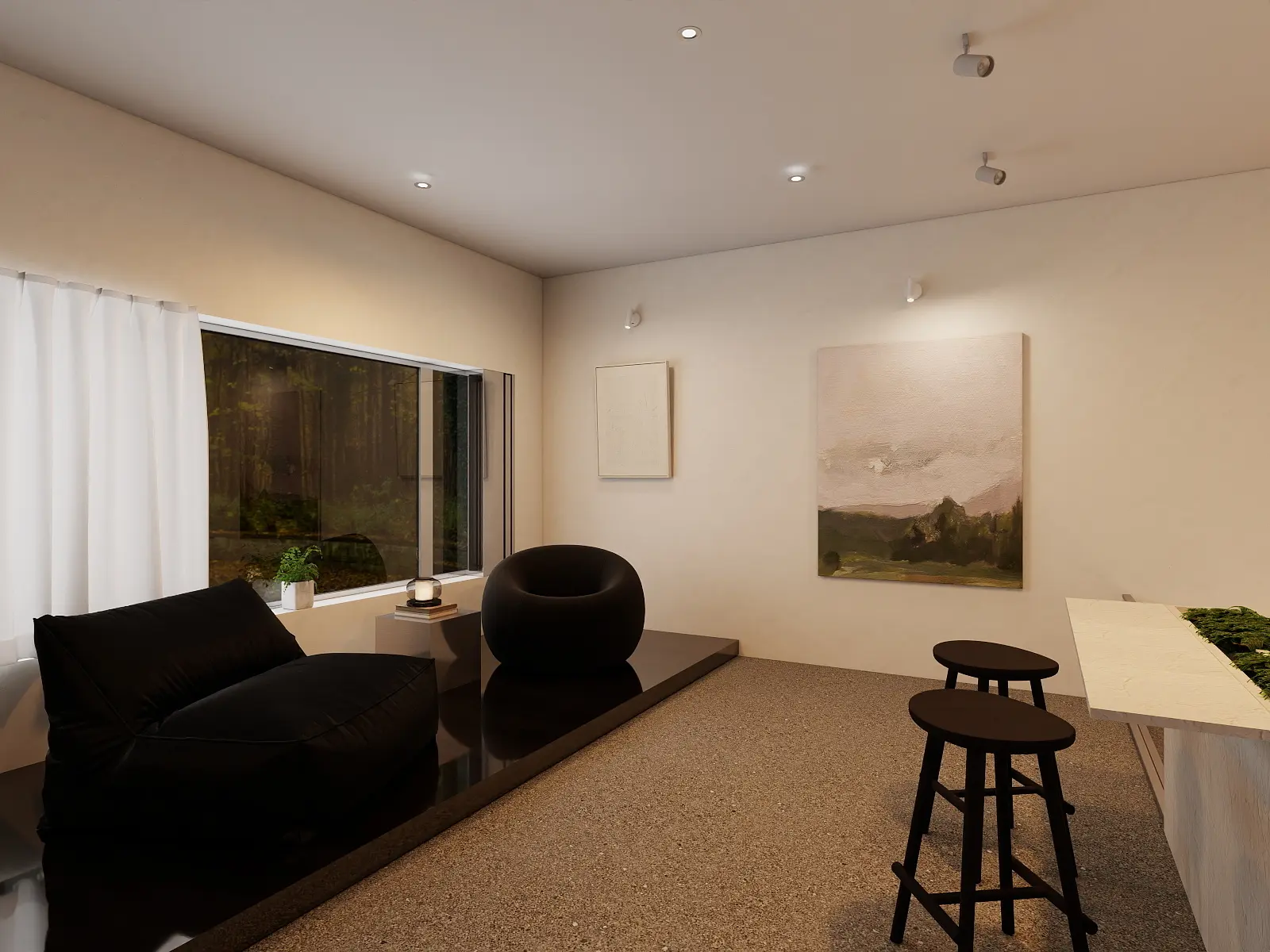 Được xem như “linh hồn” của quán. Bộ sofa bọc vải trung tính kết hợp với bàn Inox bóng, thảm dạ xám và đèn tường giúp tạo điểm nhấn thị giác, đồng thời đảm bảo cảm giác ấm cúng. Hệ kệ decor tone đen – nổi bật với layout tự do (free-form layout), góp phần tăng khả năng lưu chuyển ánh sáng và mở rộng góc nhìn.